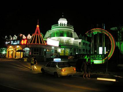 被歌声、琴声、欢笑声所吸引,我们同行三人走进了“888玛丽亚酒吧”。一方五六平方米的舞池,一顶白色的顶棚,一支麦克风,一把高脚转椅,一袭黑白衣裙,曲曲中外经典老歌……歌声袅袅,笑声盈盈听众越聚越多,满眼的俄罗斯游客边听边舞,击节而和,沉迷在迷人的歌声中。服务生满脸的笑容殷勤地周旋在客人们之间。我很惊诧于他们的语言能力,几乎每个服务生都能用俄语自然的和客人交流,要知道把每道中文菜名准确地翻译成俄文是很难的。我叫住了一位身边的服务生,拿着一张中俄文对照的菜单,问他是否真正懂得俄语。他狡黠的笑道:不懂得,就是那些菜名知道一些,常年累月就这些菜名,来的又都是俄罗斯人,自然而然就记住了。是的,学语言是需要环境的。