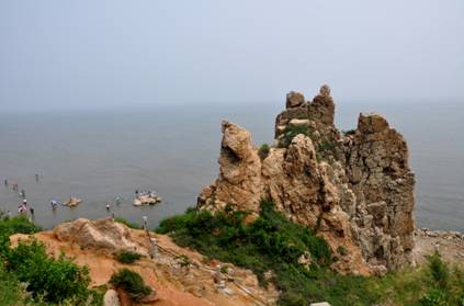 视为北戴河象征的鸽子窝公园位于北戴河区海滨东北角。在那由于地层断裂所形成的20余米的临海悬崖上,有一块嶙峋巨石,恰似雄鹰屹立在海边,因这里曾是野鸽的栖息地,所以留下了鸽子窝的名字。与这块巨石比肩而立的崖顶上,建有一座具有民族特色的亭子--鹰角亭。陪同导游告诉我们:该亭始建于1937年,几经翻修,现在亭上挂有全国人大常委会副委员长胡厥文1983年的题匾。亭南的大理石卧碑上,镌刻着毛泽东1954年秋在这里构思赋就的《浪淘沙·北戴河》,在鸽子窝的南面是一座望海长廊,长廊的南北两头分别由四角亭和敞亭组成。坐在长廊的木椅上,远眺一望无际的大海,任凭清凉的海风拂面,带走一身的倦意。盛夏酷暑的响午竟也如此清凉,连鸽子都流连忘返、在此筑巢繁衍了。此时的我竟羡慕起它们的聪颖与智慧。