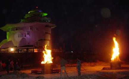 园区中央搭建一个巨大的舞台,灯光璀璨、闪烁迷离。舞台中央不知名的乐队与歌手演唱着我听不懂的爵士乐曲,震耳欲聋。舞台三面满是些桌椅,供游人消遣、听歌。服务生殷勤的穿梭其间给客人们上着啤酒、烤鱼烤虾什么的,忙的不亦乐乎。离舞台不远的沙滩上,支撑着四堆木材,旁人告诉我们:旅游的旺季每到周末晚九点都会有篝火晚会,那些少男少女们牵着手围着篝火载歌载舞,都会衍生出很多爱情故事。篝火是享受不了了,那是年轻人的事,故事还是要听的。夜色、涛声、沙滩、篝火,一应俱全,这大概就是年轻人的浪漫乐园了。