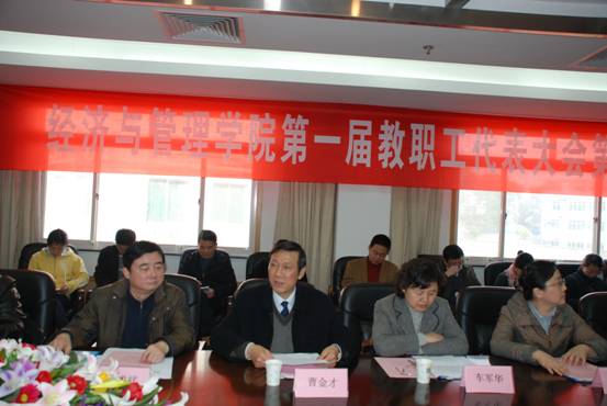 2011年3月13日上午9:30,经济与管理学院首届教代会第一次会议在三牌楼校区科学会堂第三会议室隆重召开,校党委副书记曹金才,校工会主席车军华应邀出席大会,学院党政领导班子,全体正式代表、列席代表参加会议。大会由党委副书记、院工会主席彭刘生主持。大会在嘹亮的《国歌》声中隆重开幕。