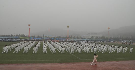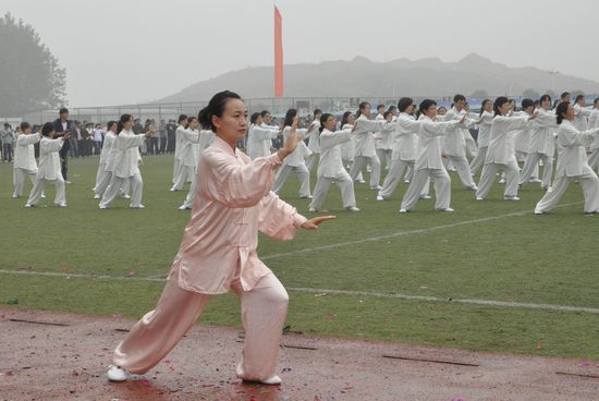 在运动会开幕仪式的表演环节,来自我校行政部门、各院系、直属单位的260名教职工组成的代表队进行了二十四式太极拳表演。他们身着白色练功服,迈着豪迈的步伐踏上体育场。在飒爽的行礼之后,古朴悠美的旋律响起,表演开始。在轻柔慢匀、开合有序的招式中,教师们动作柔和舒缓、协调统一,神情镇定自若,显示出刚柔相济的太极韵律和从容大气的太极气势。精彩的表演吸引了场内外所有师生的目光。表演结束后,师生们给与了热烈的掌声。