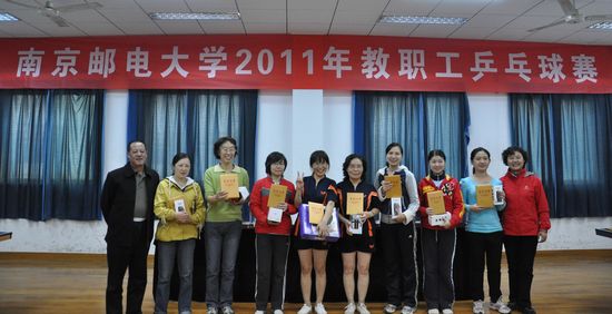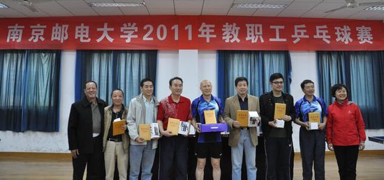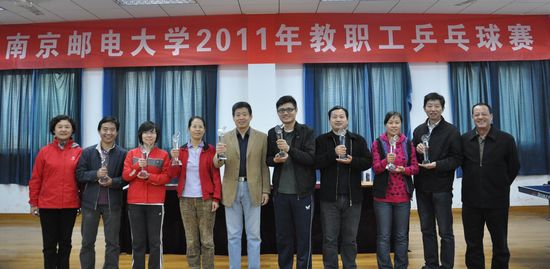 11月13日下午,由校工会举办的2011年教职工乒乓球赛圆满结束。经过2天紧张激烈的角逐,计算机学院、软件学院代表队荣获本次比赛团体第一名,机关,后勤服务集团,理学院,继续教育学院,电子科学与工程学院,通达学院,图书馆、档案馆代表队分别获得团体第二名至第八名。刘一凡、朱之宏、姬其军、王晓冬、金仙力、吴家皋、张怀武、谢忠明分别获得男子单打比赛的第一名至第八名,潘金萍、吴瑞萍、陈珊珊、王珺、陶冶薇、陈希、许立炜、潘文婵分别获得女子单打比赛的第一名至第八名。