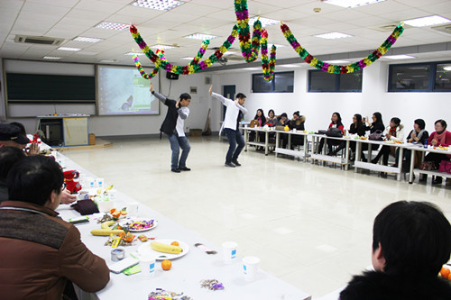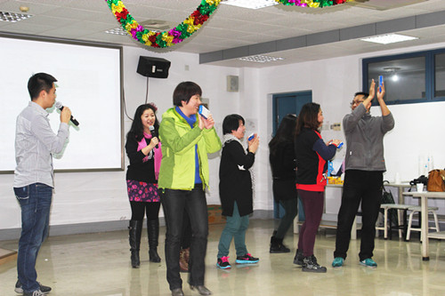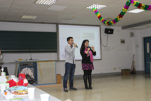 总结大会结束后,由学院工会主办的2015年新春联欢会拉开帷幕,学院领导与教职工欢聚一堂,其乐融融。联欢会由董燕娜、刘晓宁两位老师主持,一个个精彩有趣的游戏、歌舞、相声闪亮登场,不管是趣味游戏《你来比划我来猜》,还是极具挑战性的《智力抢答》、《传吸管》,大家都踊跃参与,现场欢声笑语不断,气氛热烈。由刘晓宁、朱晓萌两位老师表演的舞蹈《小苹果》动作夸张,诙谐幽默;王平院长、范建华老师表演的京剧《智取威虎山》字正腔圆,韵味醇厚;徐磊副院长、邓艳华副书记的相声《反正话》更是令大家捧腹大笑;赵斌老师、董燕娜老师的深情演唱博得了现场热烈的掌声,最后由黄婷婷书记发起的传统节目《萝卜蹲》更是赚足了笑声,将联欢会推向高潮。