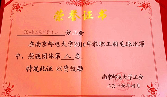 2016年南京邮电大学教职工羽毛球比赛于4月9日-4月23日在仙林校区体育馆举办,本次比赛由校工会主办,体育部协办,来自全校的21支代表队近百名老师参加角逐,传媒与艺术学院代表队最终取得了团体第八名的优异成绩。