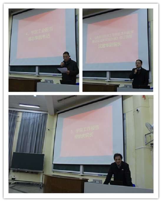 大会听取了院长程崇虎作《通信与信息工程学院工作报告》,工会主席高志华作《学院工会工作报告》以及副院长沈建华作《通信与信息工程学院本科教学建设及成果奖励办法》修订说明。