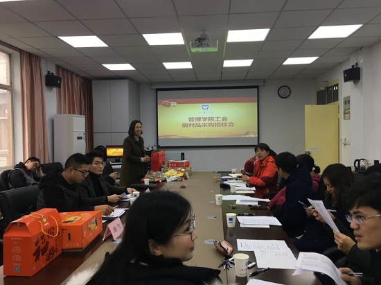 2018年12月21日下午,管理学院分工会在306会议室举行元旦、春节节日慰问品采购招标会。参加本次会议的有学院党委副书记、分工会主席邓艳华,学院工会委员、工会小组长以及5家投标单位代表。会议由分工会副主席闾越老师主持。