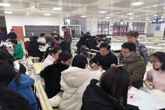 包饺子开始,大家先将面皮摊开在左掌心,目测着大致的用量,随后用筷子夹起一小团肉馅,将白菜鲜肉、玉米鲜肉、芹菜鲜肉、三鲜香菇鲜肉等各色馅小心翼翼堆在面皮中心,少则干瘪,多则饱溢,蘸清水涂抹于面皮周边为粘合做好准备,接下来便是最为考验大家的时刻,捏紧面皮四周,并折出花褶子。书记、老师和同学们各显神通,手中的饺子样式五花八门,擅长包饺子的悉心地指导其人。一个个大家亲手包的饺子很快便完成了,在食堂阿姨的帮助下,饺子入锅煮沸,不一会便喷香端出,大家看着视频,玩着游戏,吃着饺子,唱着歌,场面欢乐热闹。