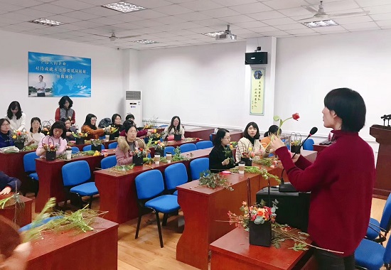 活动伊始,管理学院党委副书记、分工会主席邓艳华致辞,表达了对我院女教职工的节日祝福,祝福她们工作顺利,青春永驻。随后,特邀凡花是景工作室花艺师凡莹老师给大家带来一场视觉享受的花艺培训讲座,传授插花的基本知识以及手法,包括插花的基本步骤,花卉的特点,色调搭配以及剪花的技巧。台下的“园丁们”一改往日的风格,一边听课一边饶有趣味地互动,模仿老师的手法进行插花实践。插花需要耐心,匠心,这是我们管理学院人的品质,更是南邮人的品质。随着时间的流逝,一件件成品相继出炉,花艺师为大家点评作品,并加以调整,大家沉浸在插花的喜悦中,活动以大合影落下帷幕。