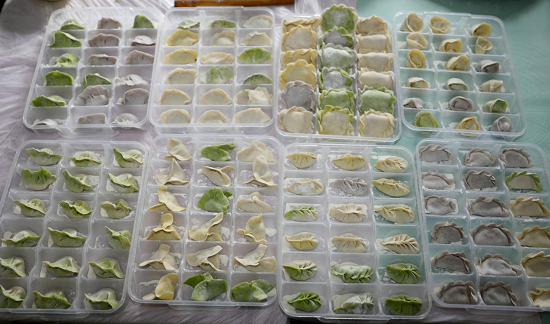 比赛中,各支队伍分工协作,有人揉面,有人擀皮,有人包褶,大家配合默契,干得热火朝天。看看他们包的饺子,形态不一,颜色各异,各具特色:有家常饺子、三角饺子、柳叶形状、锁边饺子、元宝饺子、葵花饺子、鸳鸯蒸饺等,饺子皮的用色则有黄的、绿的,红的、双色的……真是美轮美奂,创意无限。
