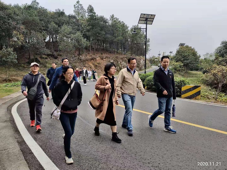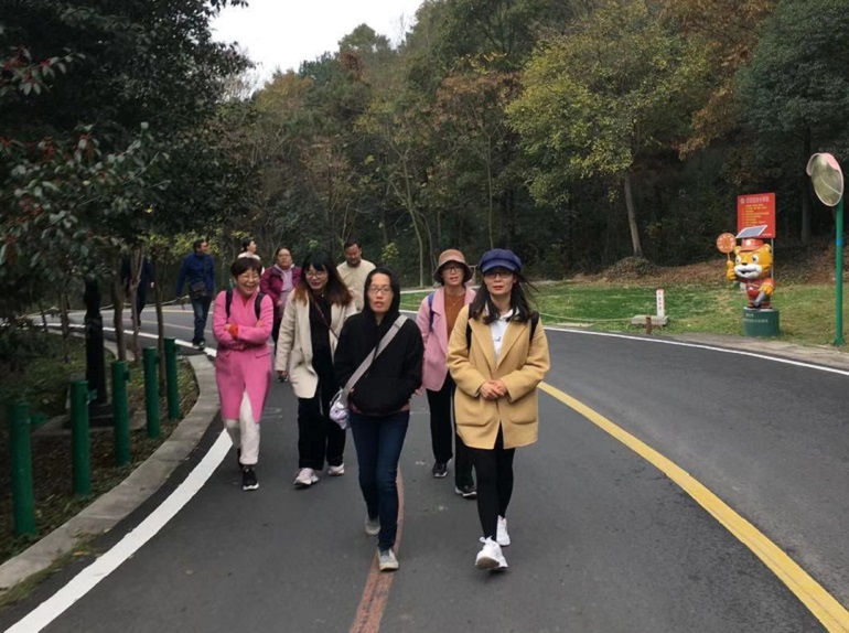 当天下午,学院老师们移步无想山国家级森林公园,参加健身走活动。无想山位于溧水区城南新区,周围群山环绕,树木葱郁,湖光山色,众多文物古迹散落其中。老师们沿着彩虹公路依山蜿蜒而上,呼吸着清新的空气,欣赏着路边火红的枫叶以及脚下山岭之间自然的美景,在欢声笑语中共攀最高峰。大家兴致勃勃地游览了被誉为“江南第一古火山口天池”的无想山天池。天池周边环境清幽,水质清澈,小桥轻架。老师们用最简单的方式,放慢脚步,平整心态,放松心情,忆苦思甜,共同携手走在绚丽的天池彩虹步道上。