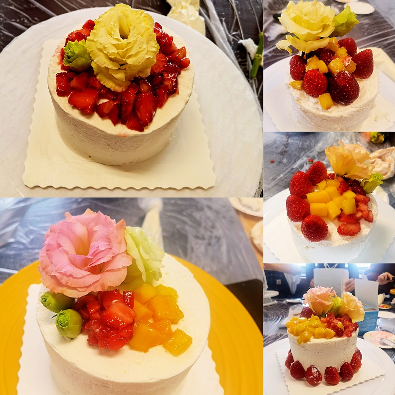 示范指导后,现场的老师们开始迫不及待的动手,先抹一点奶油,均匀平铺草莓和芒果,再抹一层奶油,再放蛋糕坯,最后进行难度最高的抹面工作。“我的蛋糕胚放歪了,要倒了”、“这怎么像抹水泥啊”整个活动现场充满了欢快的笑声,老师们充分发挥出自己的想象,制作出一个个充满创意的蛋糕。抹面结束后就到了各自发挥想象力和创造力的装饰环节,这次活动主要介绍了鲜花和水果装饰两种方法,参考指导老师的图片,每个人按照自己的想法进行创作。有的用草莓摆出图案再用鲜花装饰,有的用鲜花鲜花和绿叶搭配出唯美的气氛,每个老师都创造出了独一无二的作品。