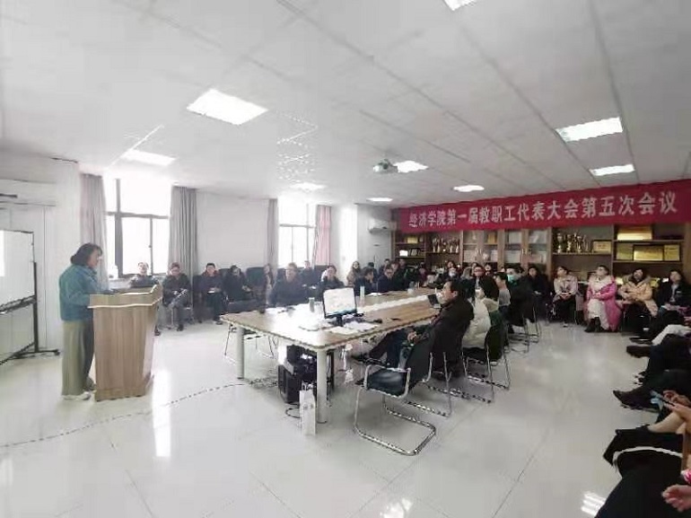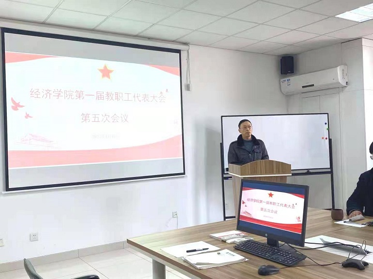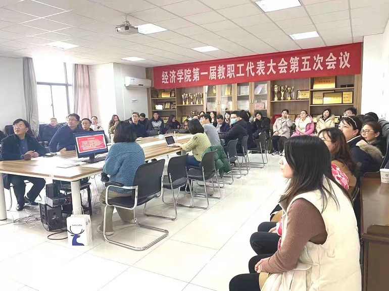 2022年1月16日下午,经济学院在文科楼529会议室举行第一届教职工代表大会第五次会议。会议由学院党委书记黄宝凤主持,全体教职工(工会会员)参加了会议。