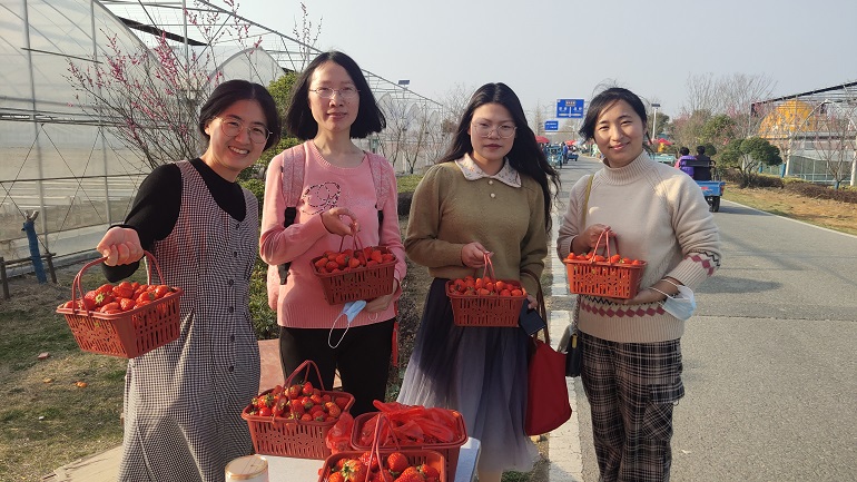 在傅家边农业科技园,大家观赏着盛开的梅花和遍地绿色,愉快地聊天交流和拍照留影,品尝各式丰富的特色美食。在草莓园,大家纷纷体验亲手采摘草莓的乐趣。