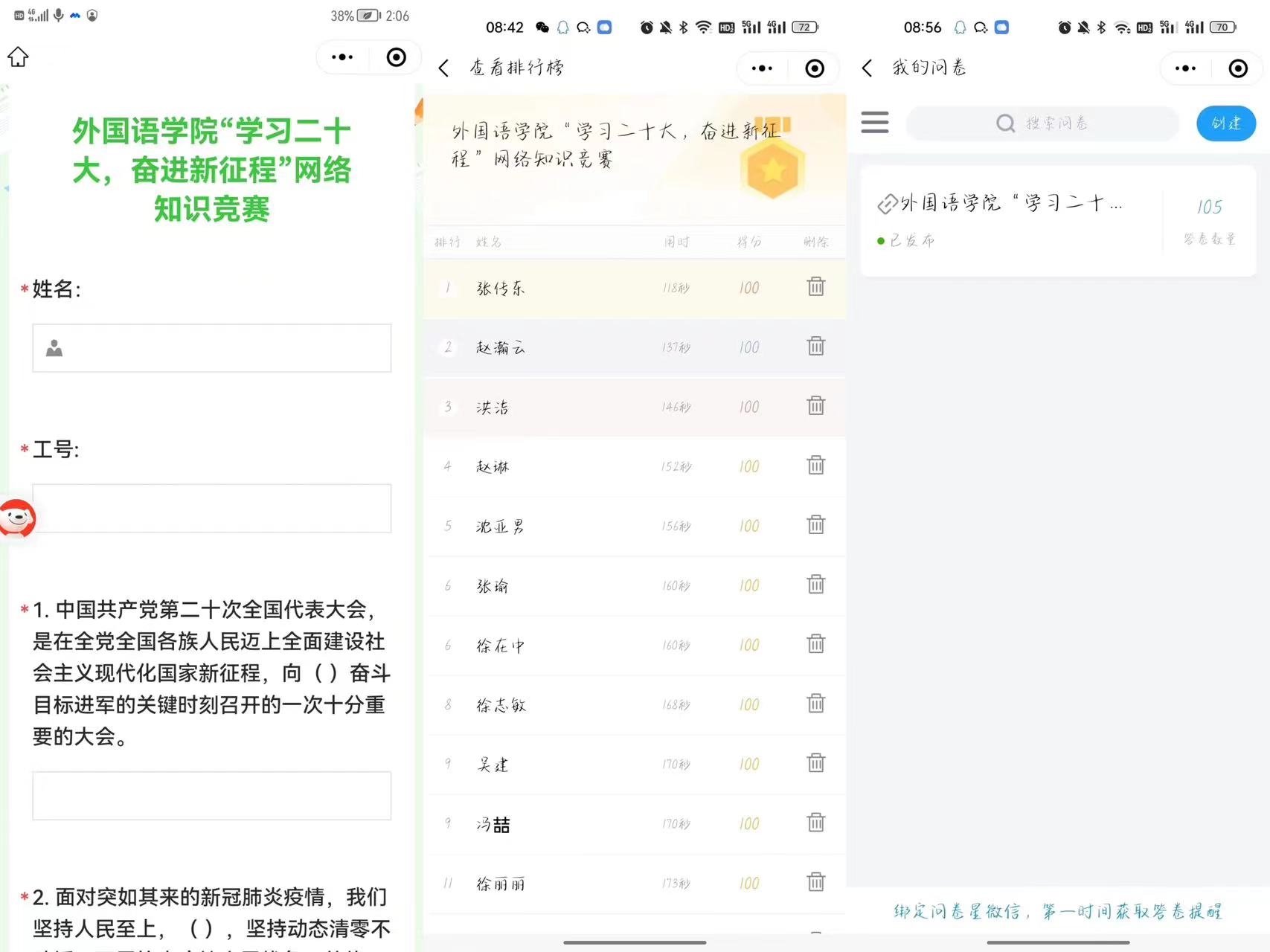 为深入学习贯彻党的二十大精神,外国语学院分工会组织开展党的二十大知识竞赛活动,本次活动以线上方式进行,全院共105位教师参加。