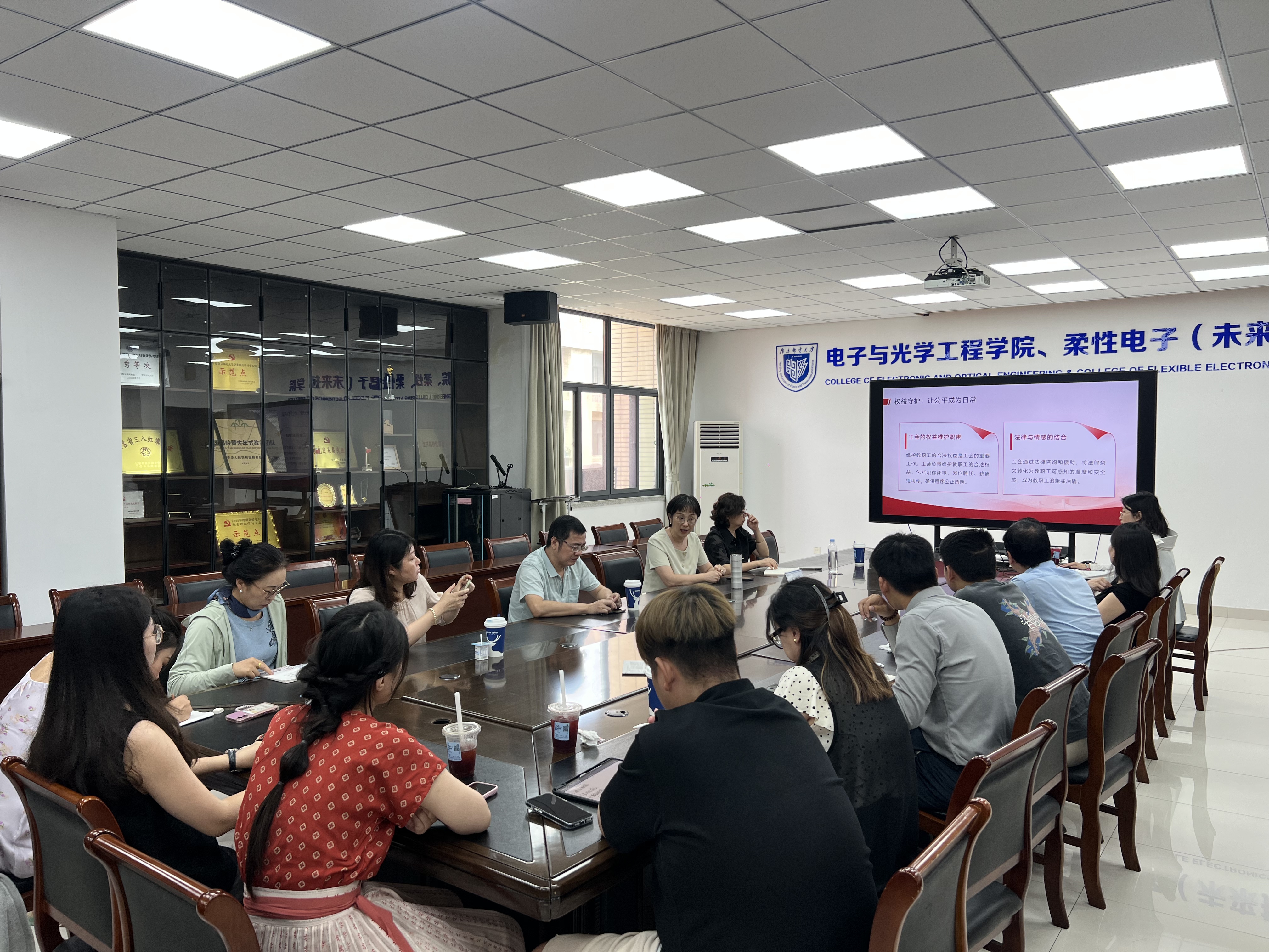 为进一步提升学院工会干部的理论素养和业务能力,明确新时代高校基层工会工作定位与职责,推动工会工作提质增效,9月22日中午,电子与光学工程学院、柔性电子(未来技术)学院工会在电光学科楼 A327 会议室召开工会干部培训会。本次培训特别邀请校工会主席黄婷婷主讲,培训会由院党委副书记、副院长、工会主席徐磊主持,学院工会委员和工会小组长参会。
