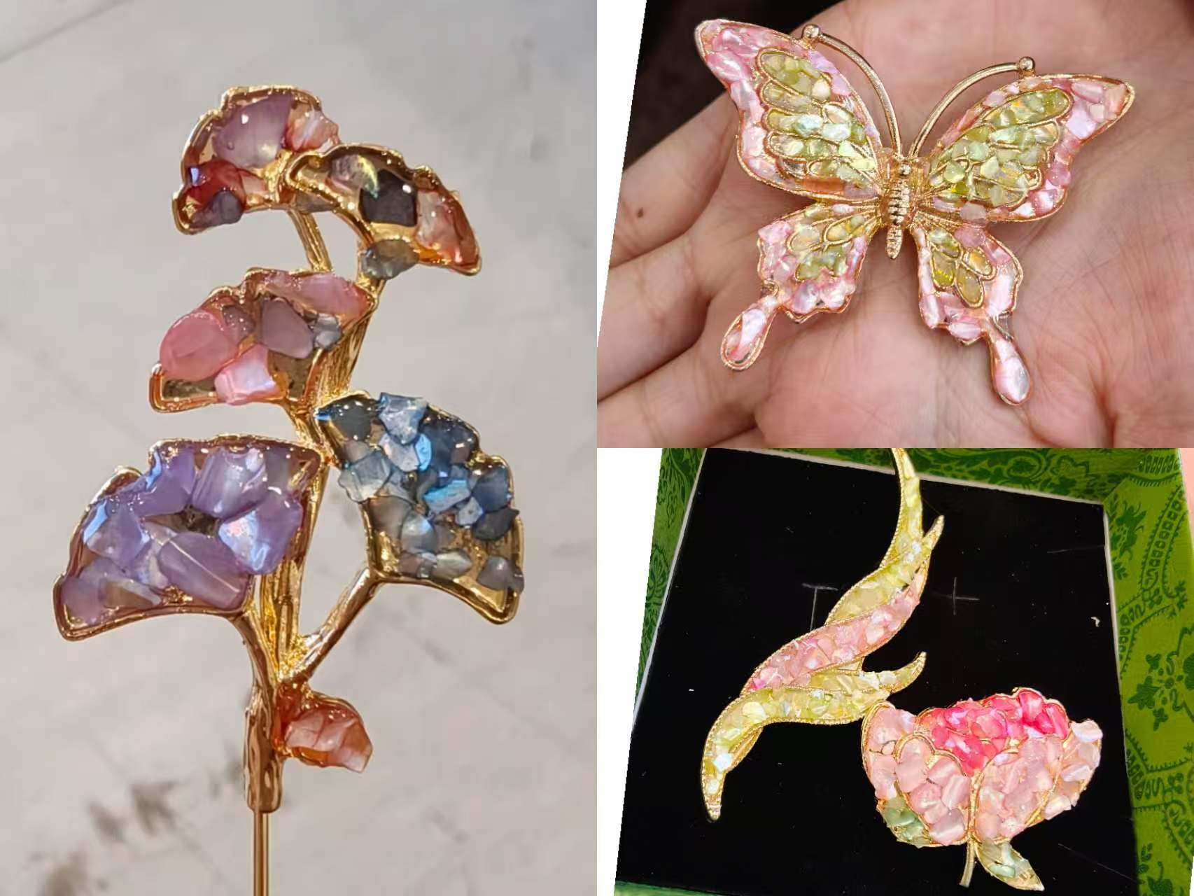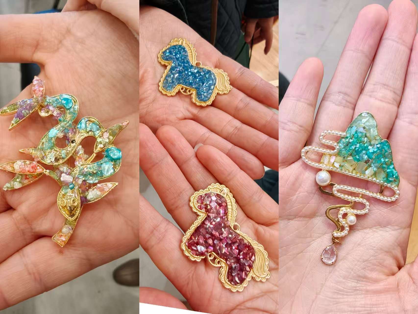 活动现场,女老师们化身“现代匠人”,挑选自己喜爱的胸针、发簪、挂件等螺钿样式,尽情发挥巧思,精研贝片拼贴和镶嵌技艺,搭配珍珠点缀。在指导老师的带领下,完成选材备料、胶黏固定、封层润色等多个制作环节。大家一边耐心制作,一边交流探讨,现场其乐融融。古老的螺钿工艺与女老师们的现代审美巧妙融合,蝶翼、繁花等纹样跃然作品之上,一枚枚独具创意的螺钿作品相继完成。制作期间,指导老师还简要介绍非遗螺钿工艺的悠久历史与文化底蕴。活动尾声,大家纷纷展示自己的作品,将贝壳的虹彩定格,成就独一无二的艺术之美。