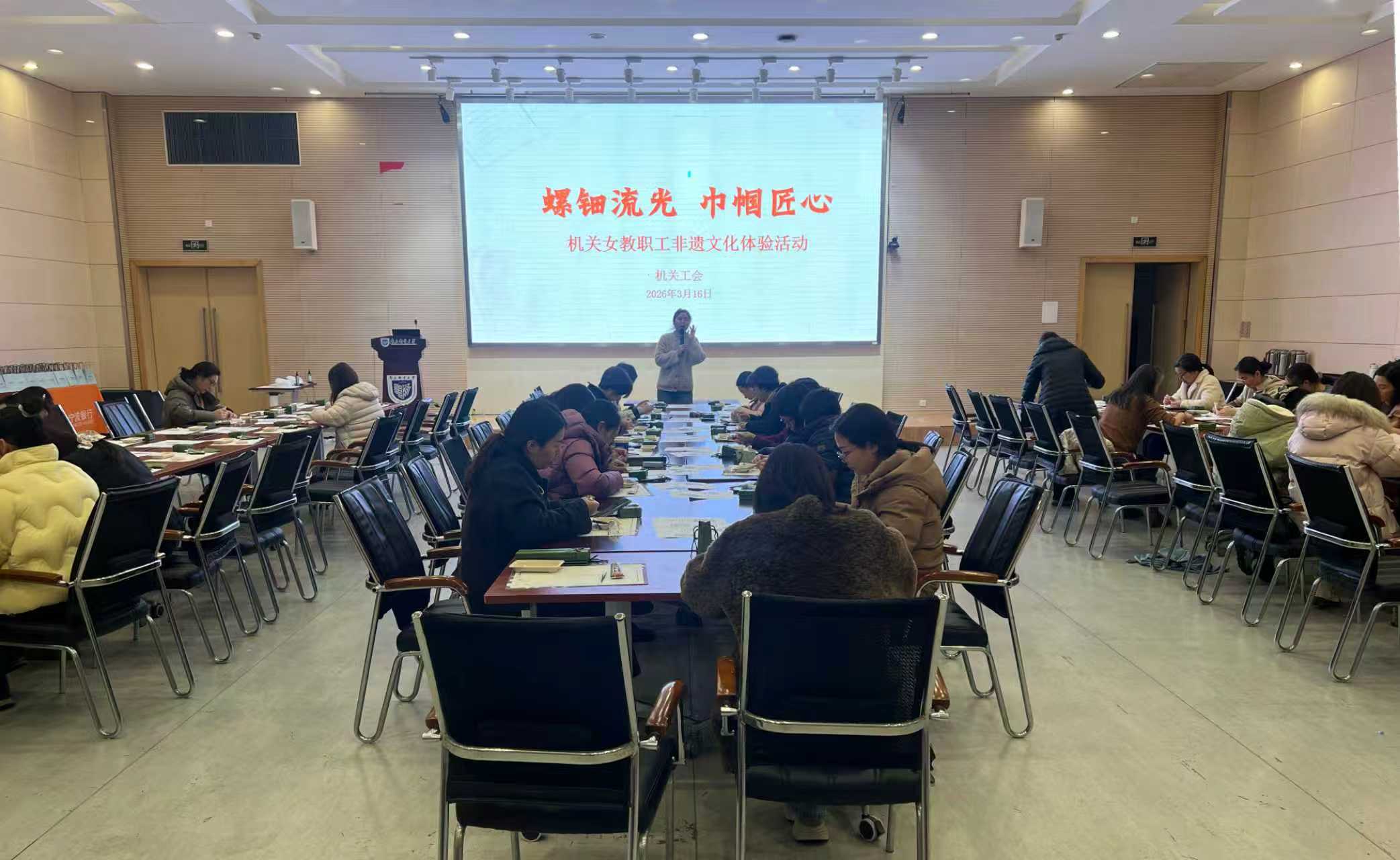 为丰富机关女教职工的精神文化生活,提升生活品质与幸福指数,3月16日下午,机关工会在仙林校区中兴报告厅举办“螺钿流光·巾帼匠心”女教职工非遗文化体验活动。党委常委、副校长姜小舜及机关60余名女教职工参加活动,活动由机关工会副主席张前主持。